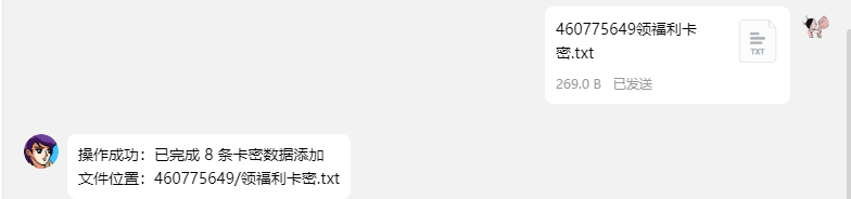 | 模式1 批量 存储随机物品 | ![]() 文件名包含群号 随机卡密,格式txt,文件发送给机器人 里面内容一行一个【支持任意文字一行一个,不只限于CDK】 | 私聊 |